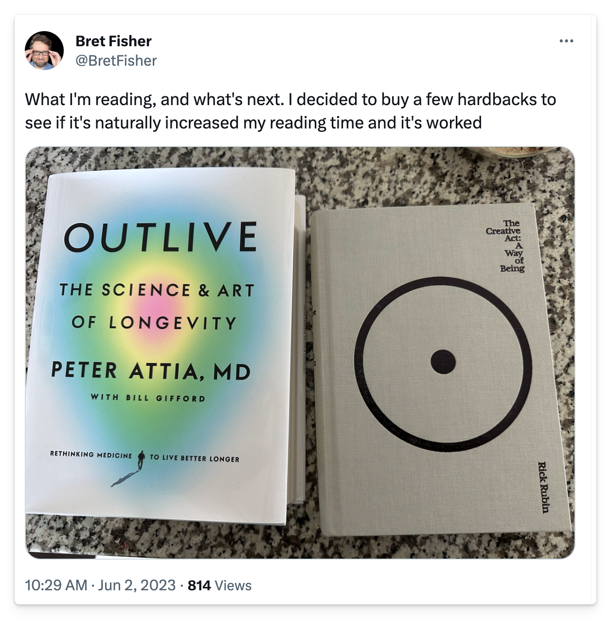 I've picked up two new books this year: Outlive, the Science & Art of Longevity by my favorite health/medical podcast, Peter Attia's The Drive, and The Creative Act: A Way of Being by Rick Rubin.