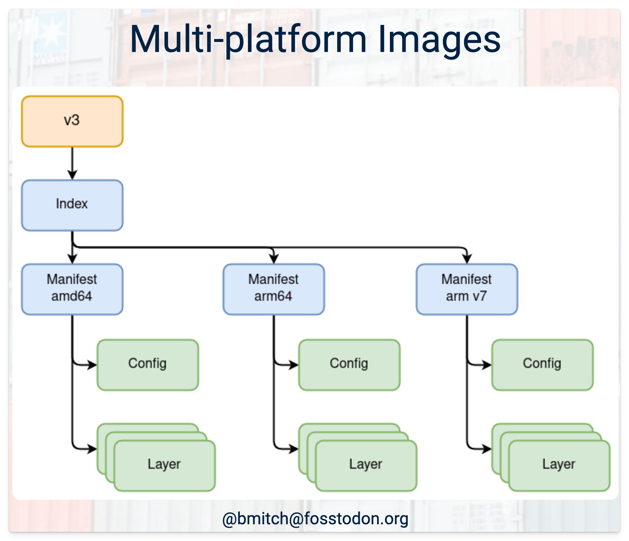 As a refresher, the OCI registry you know and love is full of two main data objects: Manifests (metadata) and layer blobs (for a container image, those are gzip tarballs). We've also got tags in the API that point to a manifest (which then may point to another set of manifests if you're building multi-arch images) and then points to one or more layers. Here's a "full-featured" example of the data relationships from Brandon Mitchell's recent OCI Distribution 1.1 RC talk on how registries relate data objects today.