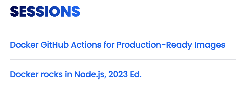 Both talks will be on Wednesday, October 4, 2023: Docker GitHub Actions for Production-Ready Images will be 10:25 AM - 11:10 AM and Docker rocks in Node.js, 2023 Ed. will be 1:10 PM - 1:55 PM.