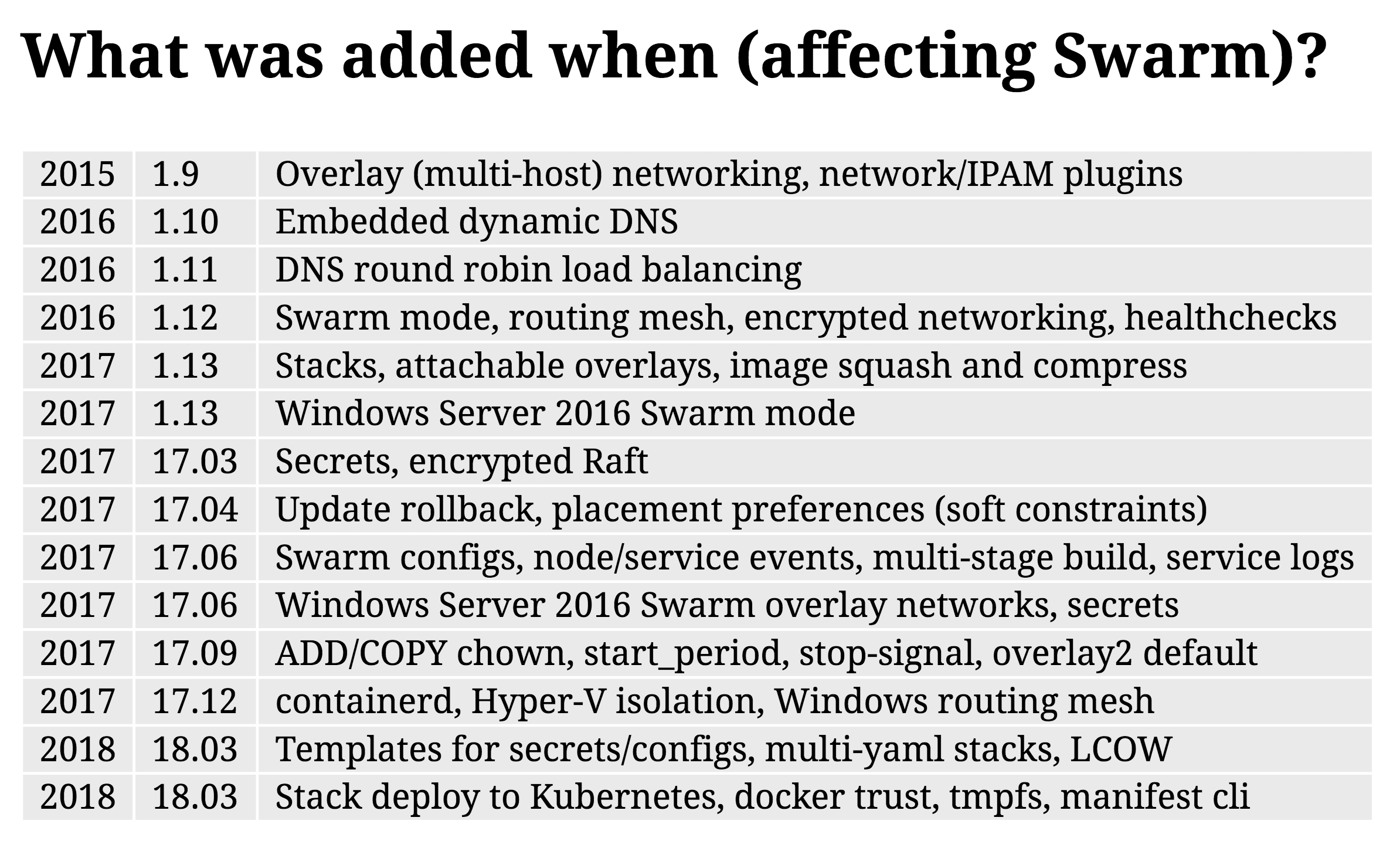 - March 9th, 2018. Docker blogs on new features coming to Swarm in Docker EE 2.0.