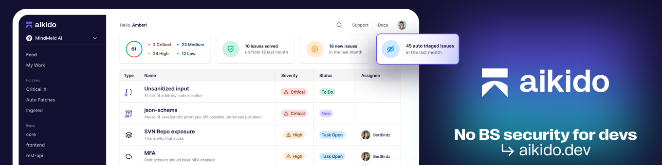 Aikido's platform helps developers get security done with its superpower to remove false positives so you can find true vulnerabilities. It has new AI features that auto triage and even fix issues for you. Aikido is free for small teams or anyone wanting to simply explore. Check it out today at aikido.dev